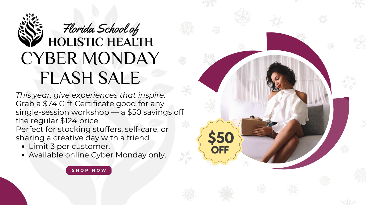 Value: Good for one (1) single-session workshop at the Florida School of Holistic Health at a discounted rate of $74 (regular price $124 — a $50 savings).